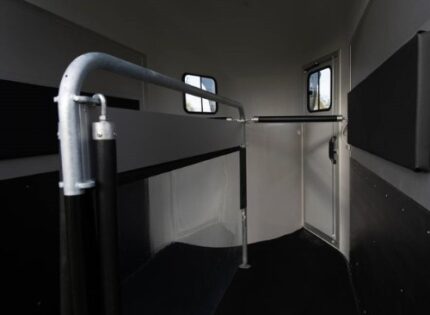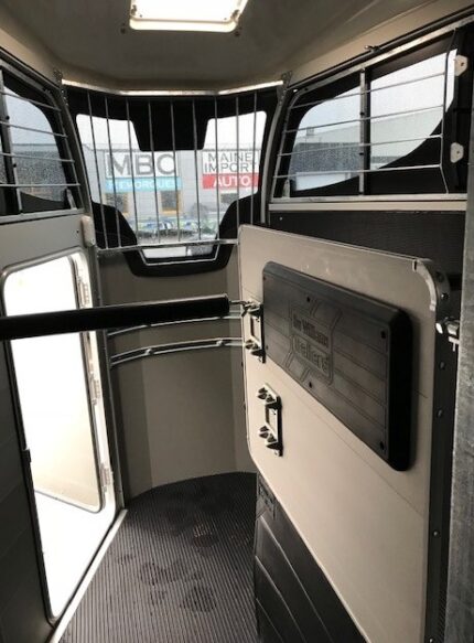 Il HBX 506, 2 posti è ideale per il trasporto di due cavalli. È dotato di serie di due finestre laterali, di un’ampia finestra anteriore, di longheroni laterali, di un portellone e di barre di sicurezza posteriori. Per i proprietari di van che cercano una maggiore versatilità, il portellone standard è ideale. Funzionando come rampa per il carico dei cavalli, può anche aprirsi come porta laterale, consentendo così a un carrello elevatore di caricare oggetti pesanti all’interno del van.