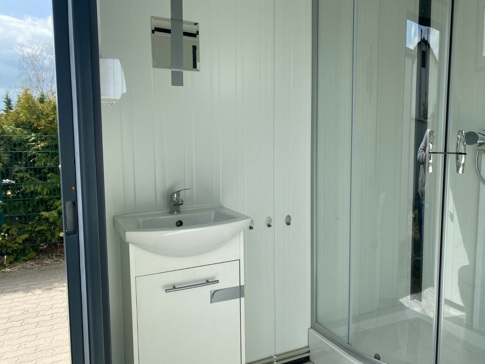 Il nostro blocco sanitario completo di 2 × 2 metri comprende un modulo dotato di WC, lavabo con mobile sottolavabo e cabina doccia.