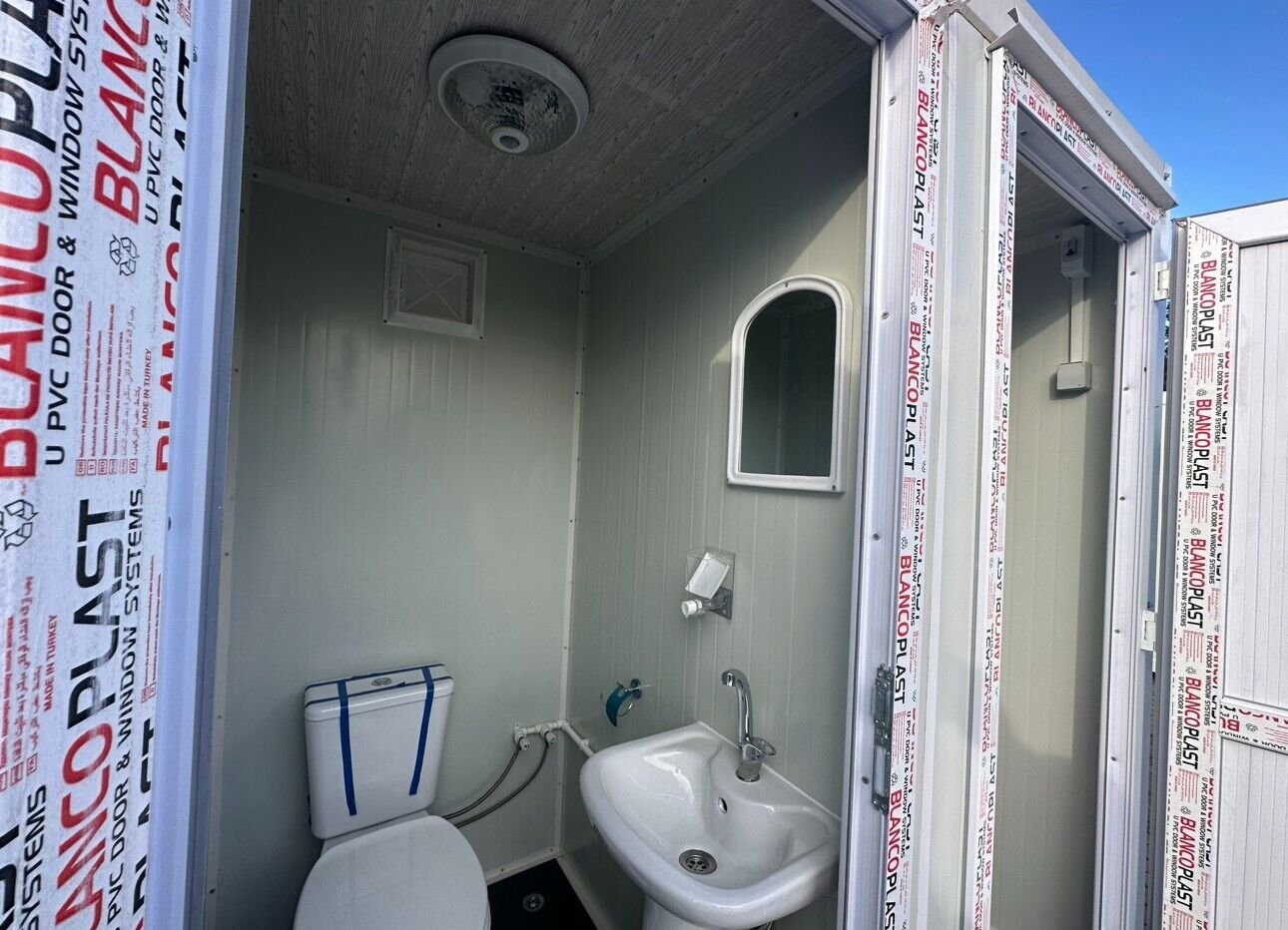 Il nostro blocco sanitario SS1 è un’unità sanitaria mobile a due porte, ciascuna delle quali conduce a una cabina WC dotata di lavabo e lavamani, con vasistas parzialmente apribili.
